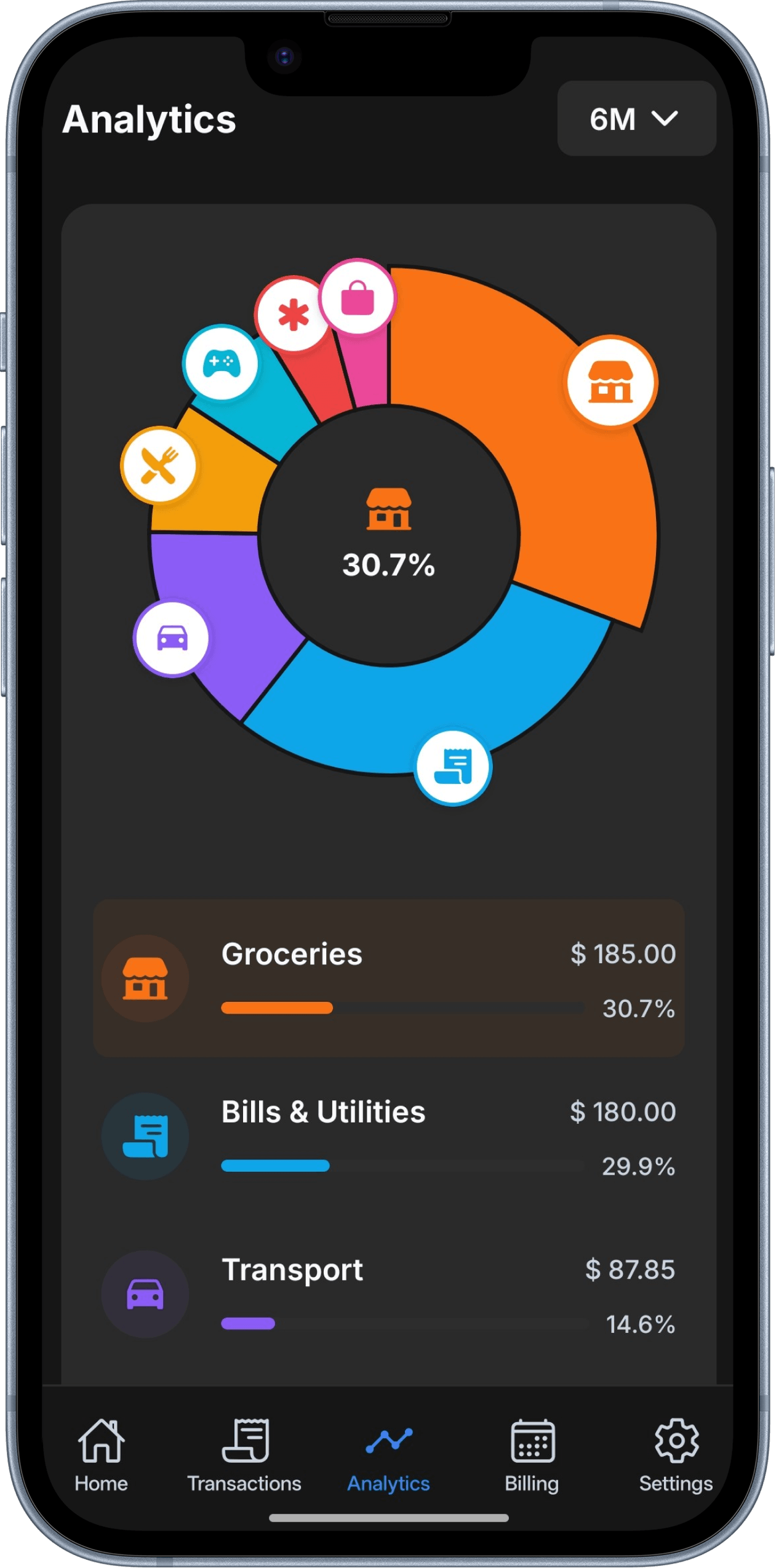 See where your money actually goes. Charts break down your spending by category so you can spot trends.